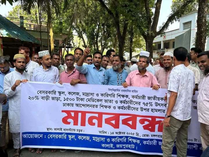 সুকমল চন্দ্র বর্মন (পিমল), জেলা প্রতিনিধিঃ জয়পুরহাটের কালাইয়ে ঢাকায় আন্দোলনরত শিক্ষক ও কর্মচারীদের উপর হামলার প্রতিবাদে ও তাদের দাবি আদায়ে