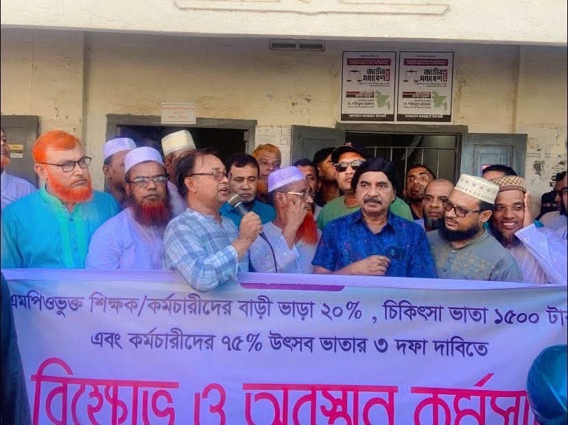 এমপিওভুক্ত শিক্ষক-কর্মচারীদের ৩ দফা দাবিতে কেন্দুয়ায় বিক্ষোভ ও অবস্থান কর্মসূচি।