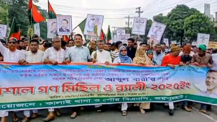 কালাইয়ে তারেক রহমানের ৩১ দফা প্রচারে বিএনপির গণ মিছিল র্যালী।