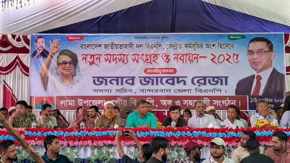 মোঃশফিকুল ইসলাম তুহিন বান্দরবান জেলা প্রতিনিধি; নতুন সদস্য সংগ্রহ ও নবায়ন–২০২৫ কর্মসূচিকে কেন্দ্র করে বান্দরবানের লামায় বাংলাদেশ জাতীয়তাবাদী দল (বিএনপি)